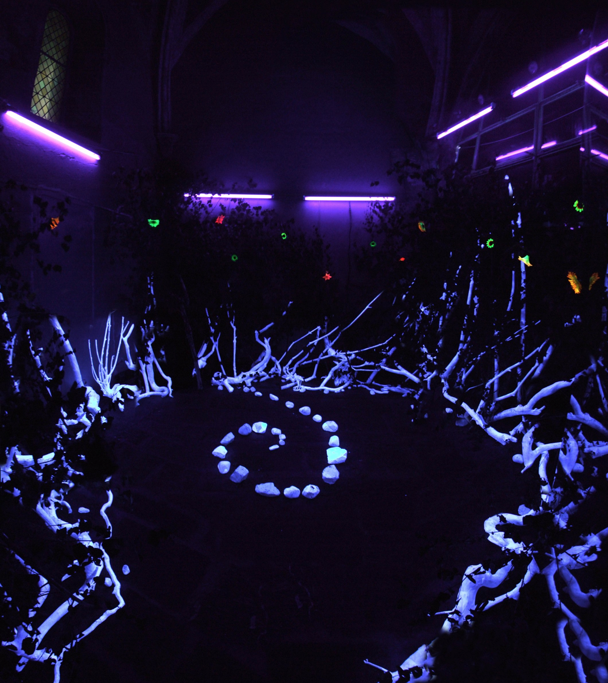 Alsos est une clairière interactive au cœur d’une petite forêt fantastique. Hybridation possible entre végétal et numérique, les fleurs de cette végétation camouflent dans leurs pistils des capteurs de lumière. Dans les contes, la forêt est l’endroit où l’on s’égare. A la fois protectrice et périlleuse, elle est ambivalente. Les spectateurs, munis de lampes-torches, déambulent dans l’espace de la clairière. A l’intérieur, ils éclairent les fleurs fluorescentes dispersées dans les branchages. Chaque fleur réagit alors par des sonorités variées qui évoluent constamment en fonction des intensités lumineuses produites par les spectateurs. Un univers acoustique évolue ainsi en fonction des intensités lumineuses, et des aléas des interventions du public.