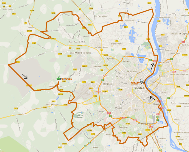 Départ 9h00 : Place des Quinconces à Bordeaux, direction le nord de la CUB Arrivée au site du bivouac à Martignas sur Jalle vers 18h.