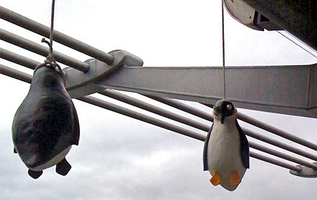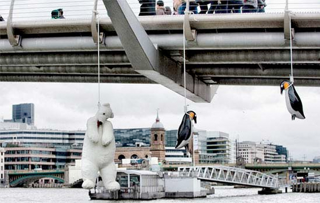 The Suicide Penguins art installation, located under Millennium Bridge in London, England features two glass penguins and a stuffed polar bear hanging from nooses.
