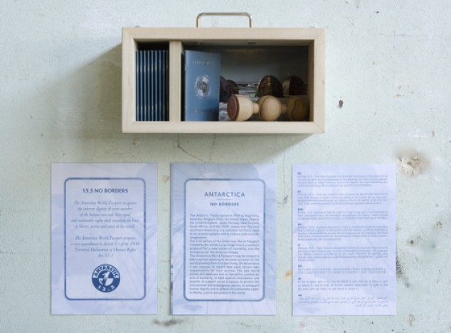 Dans le cadre de ce projet, les artistes ont créé le Passeport universel antarctique. Il s’agit d’un document qui garantit à tous ceux qui, en raison de leur statut de réfugiés ou d’immigrés se trouvent sans papiers, mais aussi à tous ceux qui le souhaitent, le droit d’adopter une nouvelle identité universelle. Ce passeport, accordé à tous ceux qui en font la demande, permet à son détenteur de devenir citoyen du monde, de marquer son opposition à la guerre et aux actes barbares, à la terreur et à la pauvreté, et d’apporter son soutien aux progrès sociaux afin de préserver la dignité humaine et de défendre les droits inaliénables de liberté, de justice et de paix dans le monde.