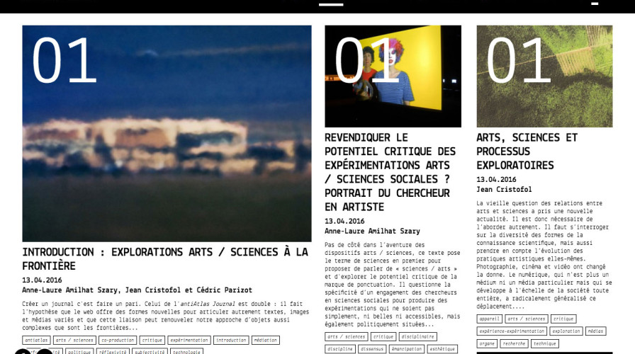 Les deux premières livraisons, Explorations art-sciences à la frontière (2016) et Fictions aux frontières (2017) rendront compte des travaux et des réflexions menées au sein de notre collectif. Les prochains numéros thématiques rassembleront des articles sélectionnés dans le cadre d’appels à proposition.