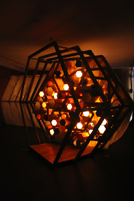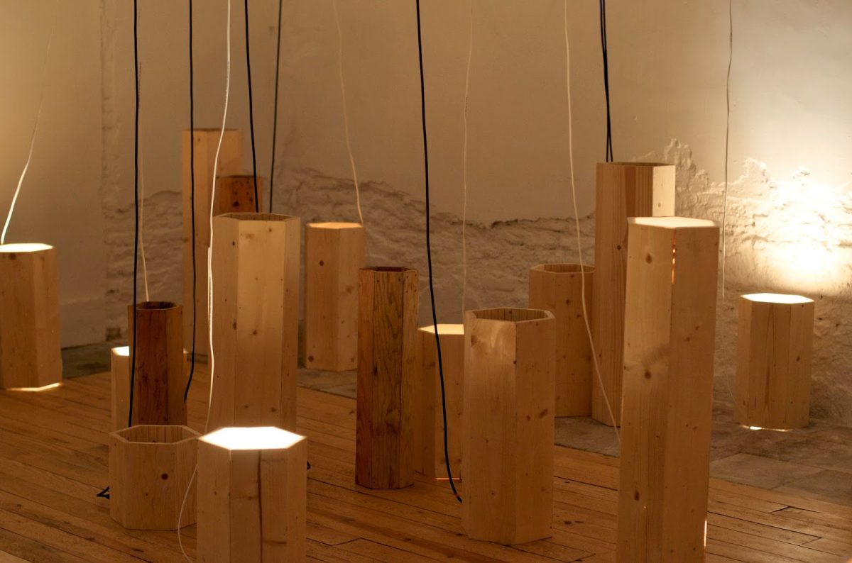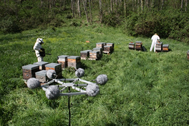Tantôt mur vibrant, tantôt couloir à traverser, parfois cabane ou grotte repliée sur elle même, l’installation se déploie comme l’essaim s’adapte à l’hôte qui lui permet de bâtir les rayons de la ruche.A partir de matériaux bruts (bois, papier, galva, cire, miel), nous réinterprétons la ruche en séries de modules plastiques qui structurent l’espace. Des enregistrements du monde apicole (sons du rucher, paroles d’apiculteurs et d’éthologues) nourrissent ces modules via des systèmes de diffusion sonore. Les changements d’échelle, les détournements de sens interpellent le spectateur et l’invitent à une exploration poétique au cœur de la Ruche à sons.