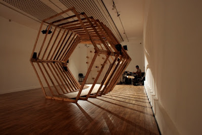 Trois musiciens font corps avec la structure qui devient une chrysalide à l’intérieur de laquelle naît et se développe une musique créée pour et sur l’instant. Tour à tour en situation d’improvisateurs, d’interprètes ou de chefs d’orchestre, ils contrôlent tous les comportements de la Ruche. Les éléments sonores et plastiques mis en présence se conjuguent jusqu’à constituer un ensemble vivant, organique et complexe, intégrant les musiciens qui s’effacent peu à peu derrière cette structure hybride.