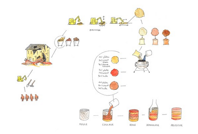 Basée à l’Atelier / TRANS305, l’équipe du projet s’implique dans la conception et la production des espaces publics de la ZAC. L’objectif est de créer un nouveau matériau composite (le Marbre d’Ici) réalisé à partir de gravats provenant des chantiers de la ZAC : une matière première locale, porteuse de l’histoire d’un quartier, valorisée au travers d’un processus artistique.